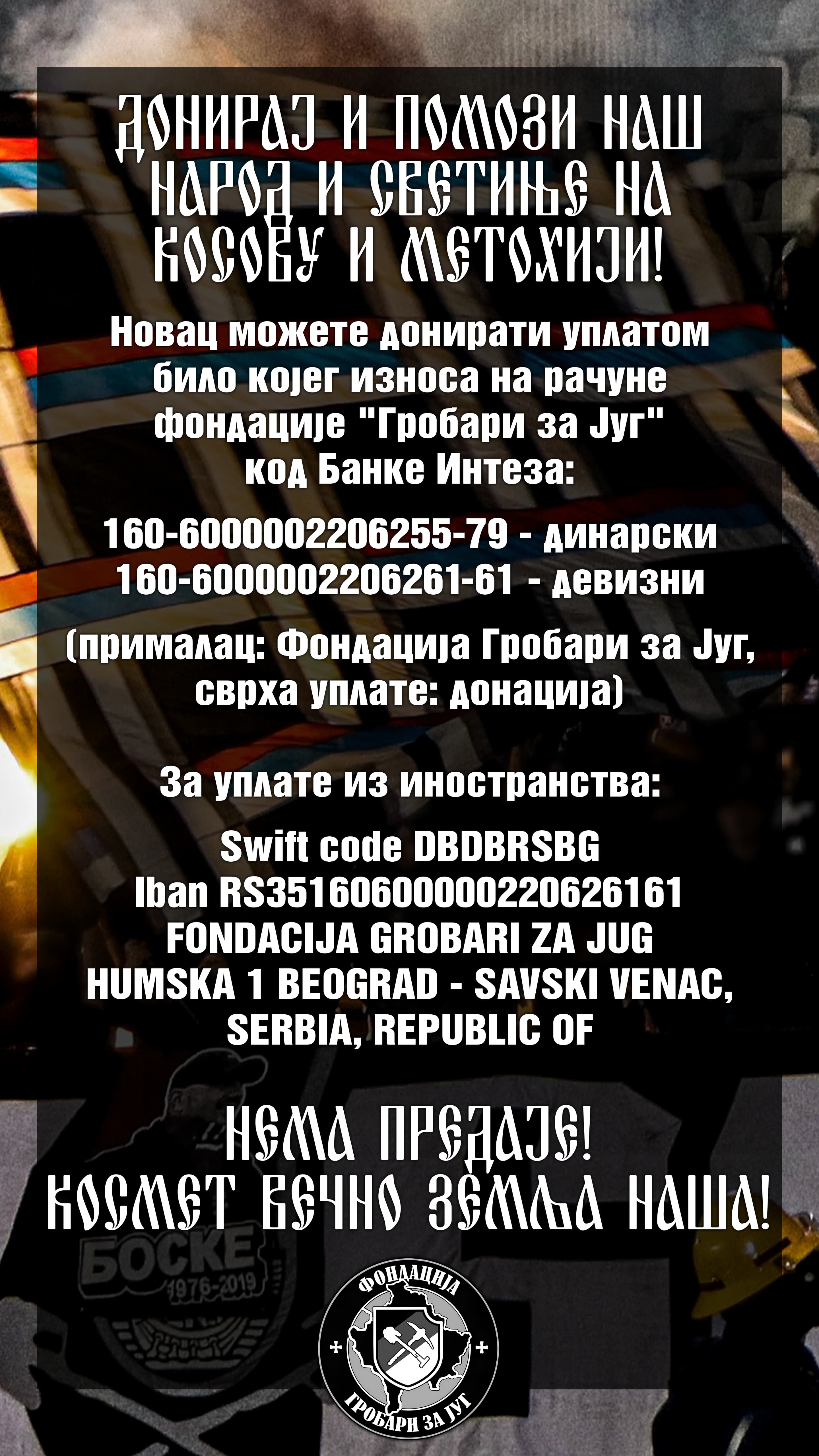 ЧИТАЈ ДАЉЕНа празник Светог Василија Великог, после вишегодишњег прикупљања и слања новчане помоћи, коначно смо озваничили рад и правно оснивање Фондације “Гробари за Југ”. Тим поводом смо у просторијама спортског друштва уприличили свечаност којој су присуствовали чланови разних секција нашег клуба, као и чланови готово свих хуманитарних организација и фондација које се баве прикупљањем хуманитарне помоћи народу и светињама на КиМ, и овим путем им се још једном захваљујемо на томе. Ово је још један велики корак у нашој борби за очување Космета и опстанак нашег народа доле, и надамо се да ће из године у годину ова прича итекако расти, јер њихов опстанак директно зависи од нас! КОСМЕТ ВЕЧНО ЗЕМЉА НАША!