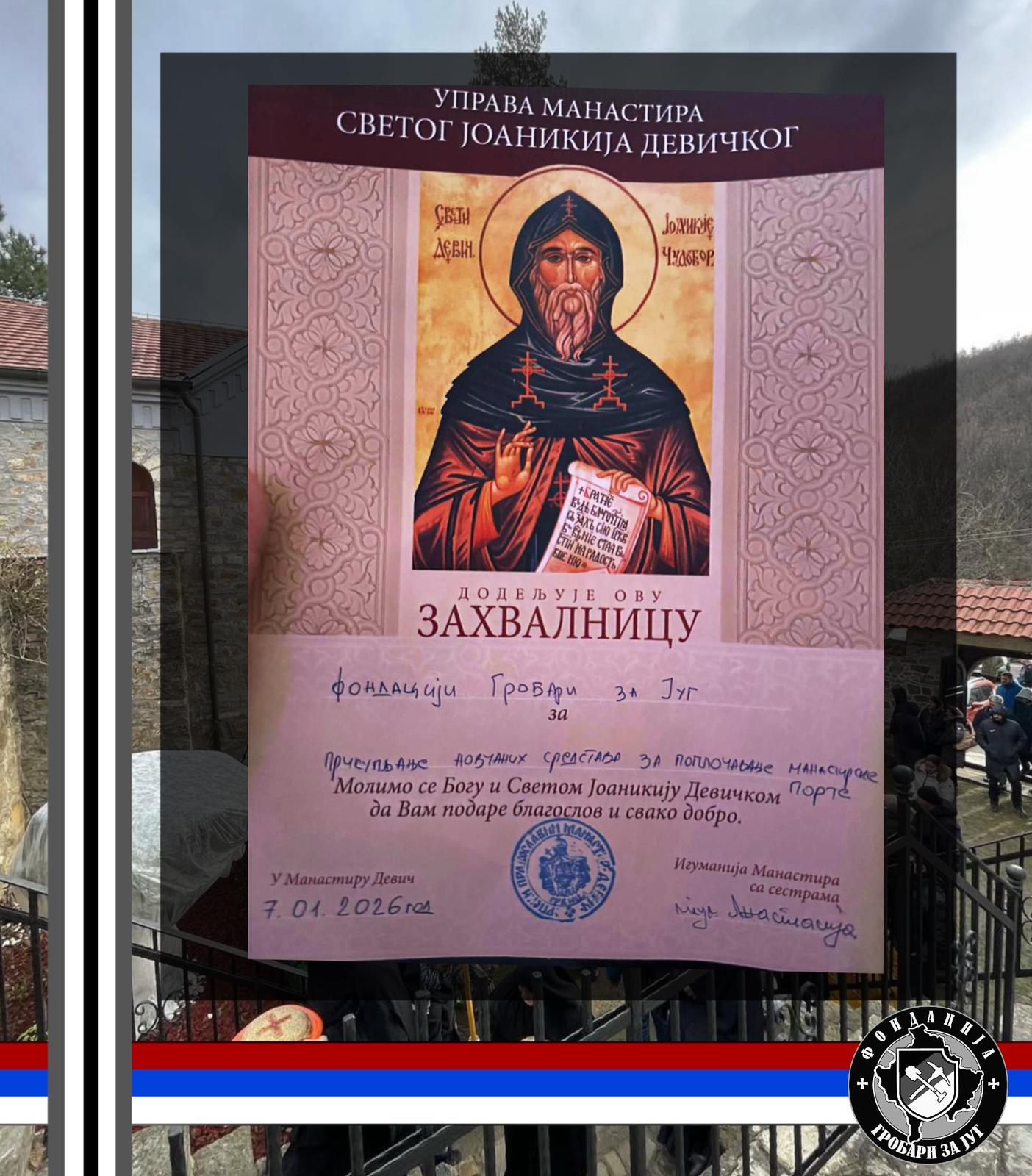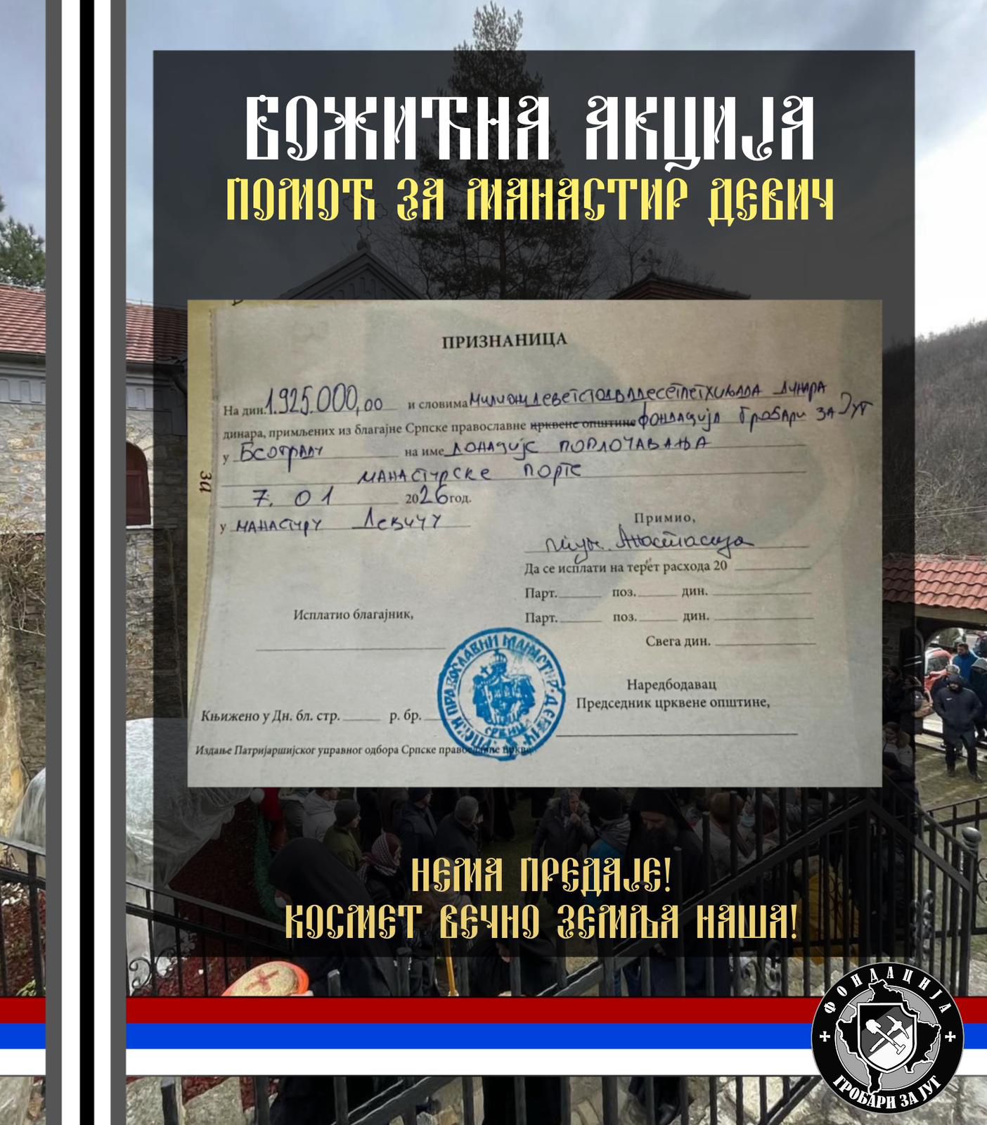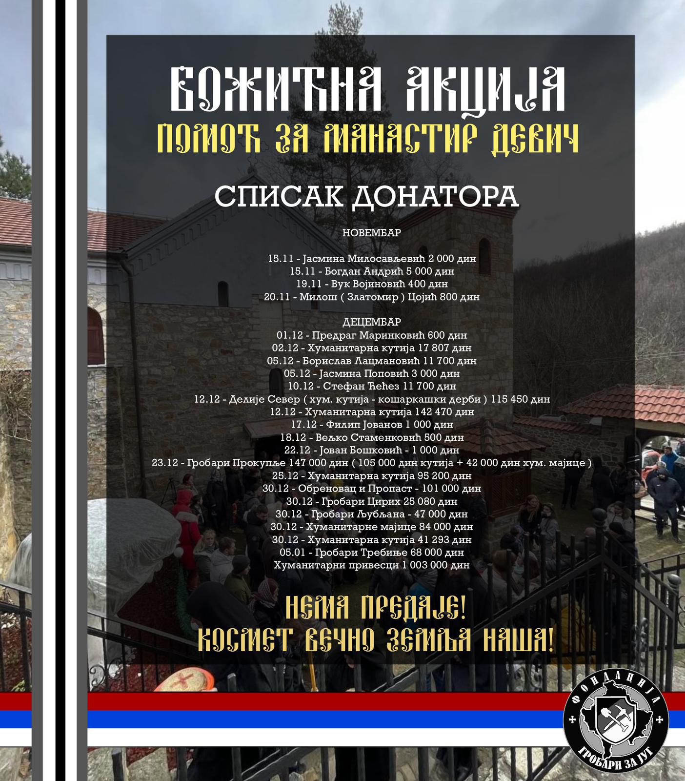 БОЖИЋНА АКЦИЈА “Гробари за Манастир Девич” Помаже Бог, браћо и сестре! ХРИСТОС СЕ РОДИ! Овим путем Вас обавештавамо да смо успешно реализовали Божићну акцију за Манастир Девич и донирали средства за поплочавање манастирске порте у износу од 1.925.000 динара! Неизмерно хвала свим учесницима и људима добре воље за несебичну помоћ и допринос у борби за очување православних светиња и српскога народа на Косову и Метохији. НЕМА ПРЕДАЈЕ! КОСМЕТ ВЕЧНО ЗЕМЉА НАША!