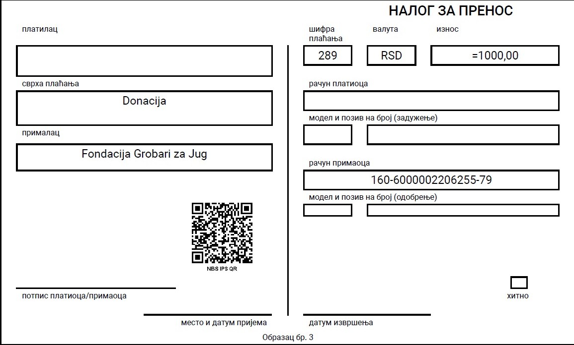 160-6000002206255-79 Прималац: Фондација Гробари за Југ Сврха уплате: Донација